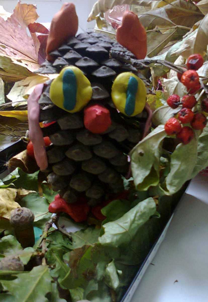 ежик – скатать коричневый шарик, взять раскрывшуюся сосновую шишку и к ее хвостику приделать мордочку, вытягивая пальчиками, затем добавить глазки и носик.