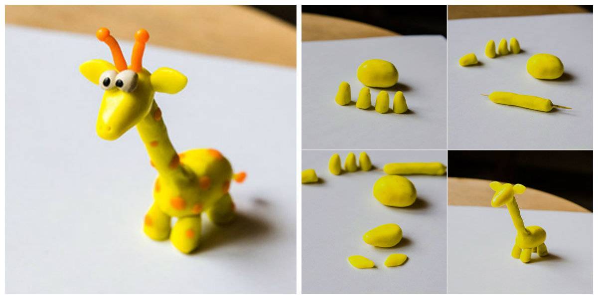 Основа делается так же, как и у слона. Длинную шею лучше закрепить зубочисткой внутри. Из коричневого или оранжевого цвета следует сделать пару рожек и пятнышки на теле.