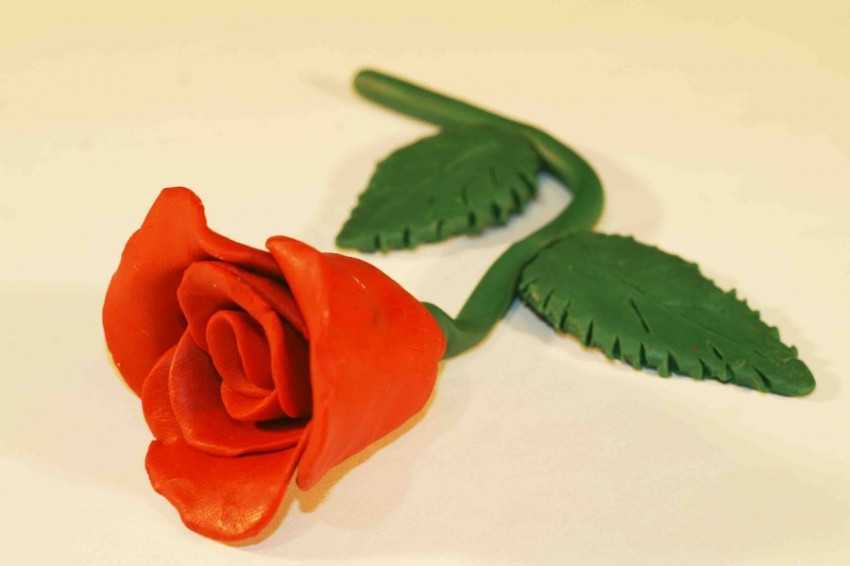 Края розы немного разгибают пальцами, чтобы получить нежные лепестки. Из зеленого пластилина лепят чашелистик, который должен находиться под венчиком цветка.