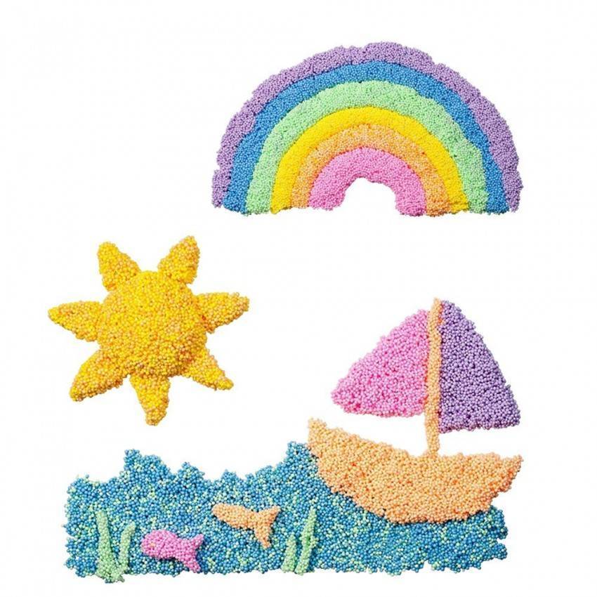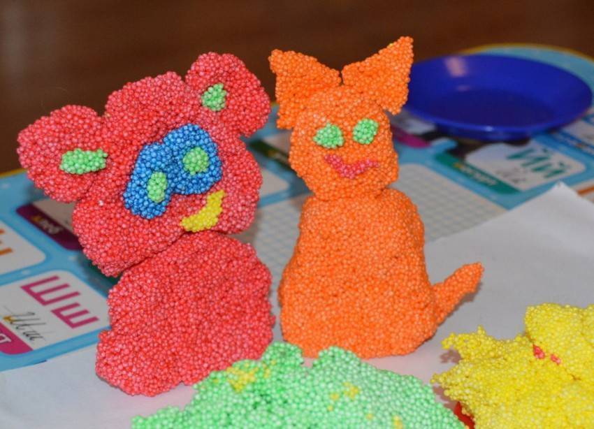 Это необычная масса для лепки, состоящая из мельчайших пенопластовых шариков, которые цепляются друг к другу за счет специального геля на глицериновой основе.