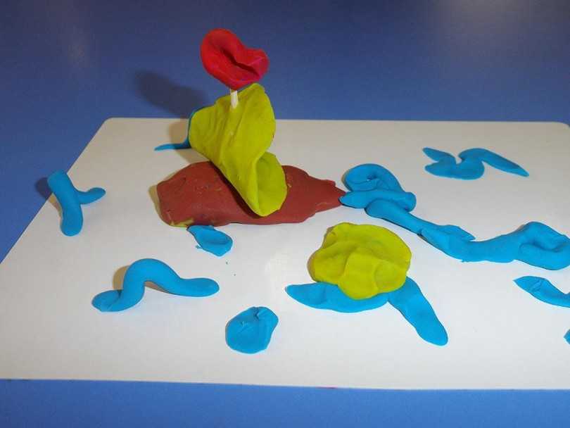 Из пластилина красного цвета делают шарик, создают жгут, которому придают плоскую форму. Из такой ленты создают бутон цветка.