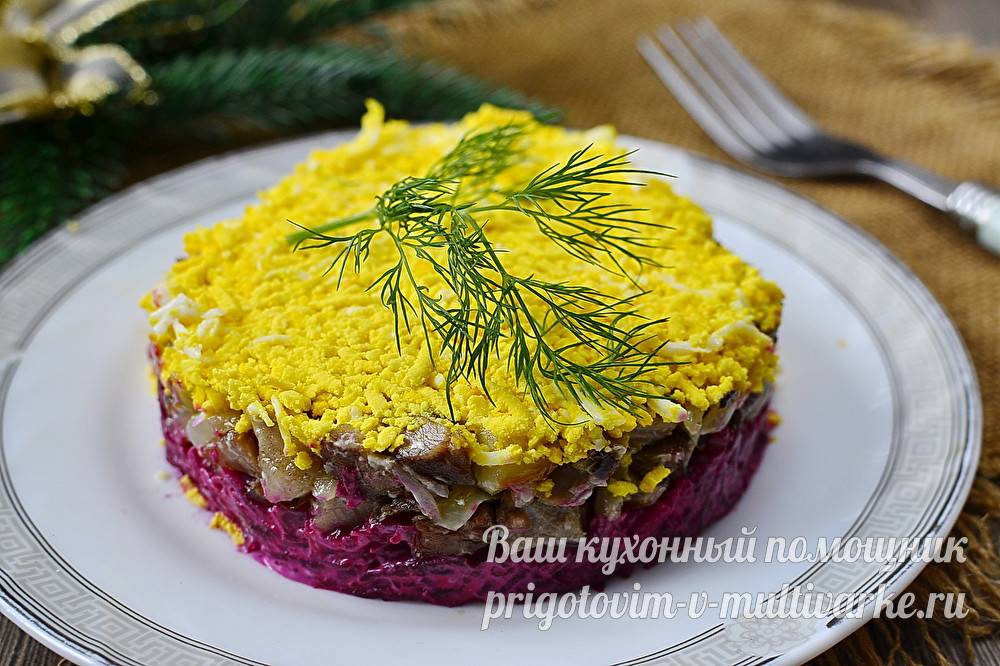 Салатница смазывается растительным маслом, слои выкладываются начиная с самого верхнего, т.е. грибов. Грибы кладём шляпками вниз, чтобы когда наш салат перевернется — всё было красиво. Последовательность слоёв салата показана на фото: