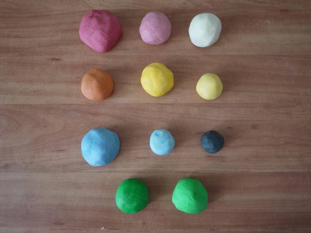 Когда масса остынет, еще раз вымесить на присыпанной мукой поверхности. Разделить весь объем на небольшие кусочки. В середине каждого сделать углубление пальцем и капнуть в центр краситель. Каждый кусочек хорошо размять, чтобы краситель равномерно распределился.