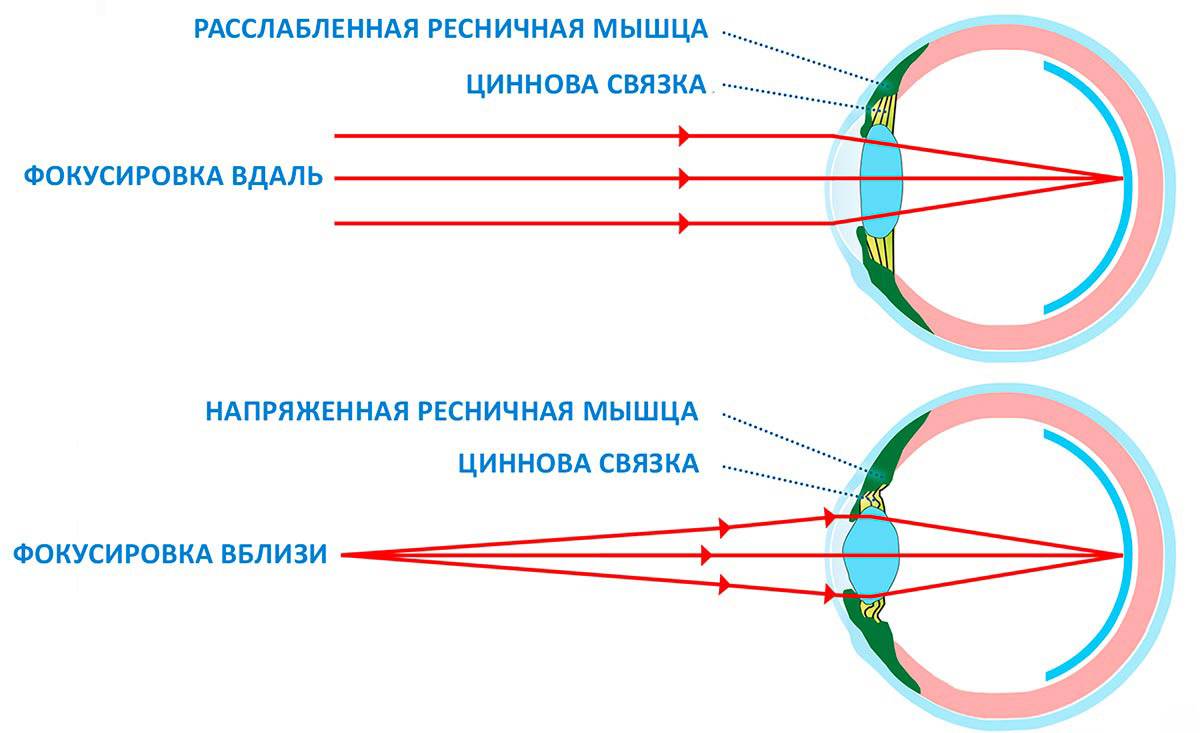 Для получения на сетчатке ясных изображений расположенных вблизи предметов, глаз должен усилить преломляющую способность за счет напряжения аккомодации, т.е. путем увеличения кривизны хрусталика. Чем ближе находится предмет, тем более выпуклым становится хрусталик, чтобы перенести фокусное изображение на сетчатку. При рассматривании далеко расположенных предметов хрусталик должен быть максимально уплощен. Для этого требуется расслабить глазную цилиарную мышцу.
