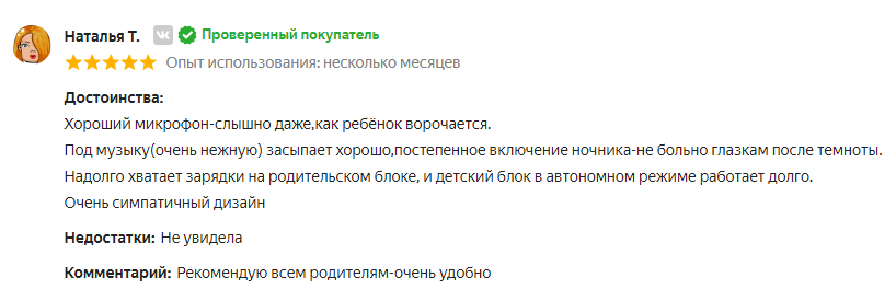 Хорошая модель для большого дома и квартиры. Микрофон очень чувствительный – слышно, как малыш ворочается. Двусторонняя связь позволяет его легко успокоить. Ночник и колыбельные мелодии незаменимы. Однако есть один минус – от батареек оба блока работают недолго.