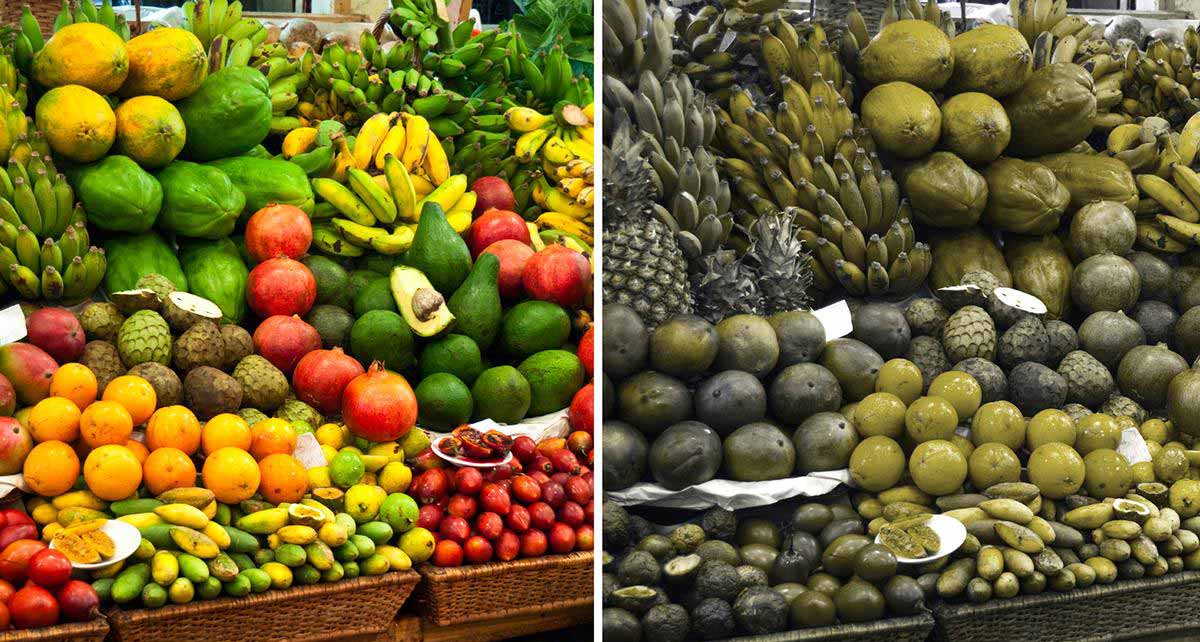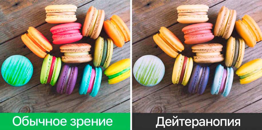 - Дейтеранопия — неспособность к восприятию зеленого цвета. Его оттенки могут восприниматься как оранжевые или розоватые.