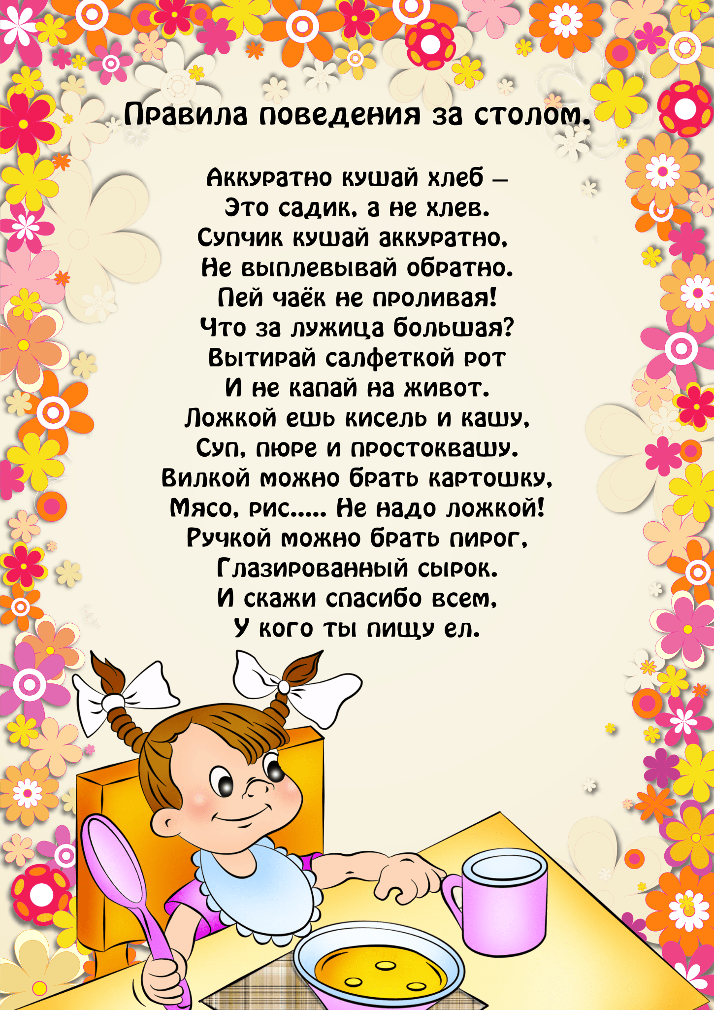 | 6. Вести себя спокойно, благодарить после окончания приема пищи | |