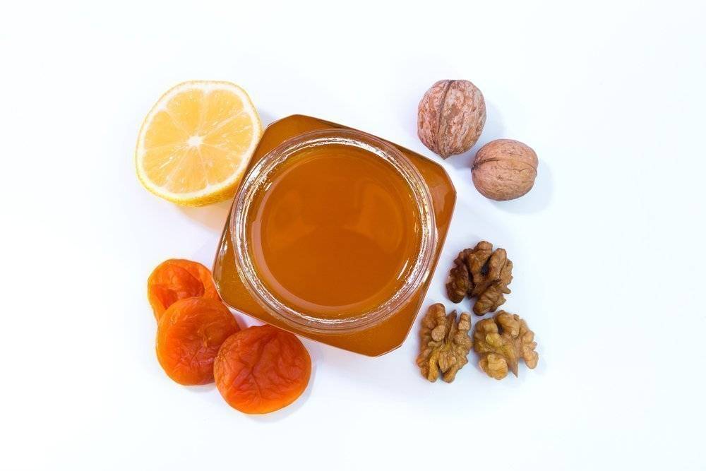 Чтобы приготовить такую смесь, нужно взять 1 стакан изюма, 1 стакан кураги, 0,5 стакана грецких орехов, 1 стакан жидкого меда и 1 лимон.